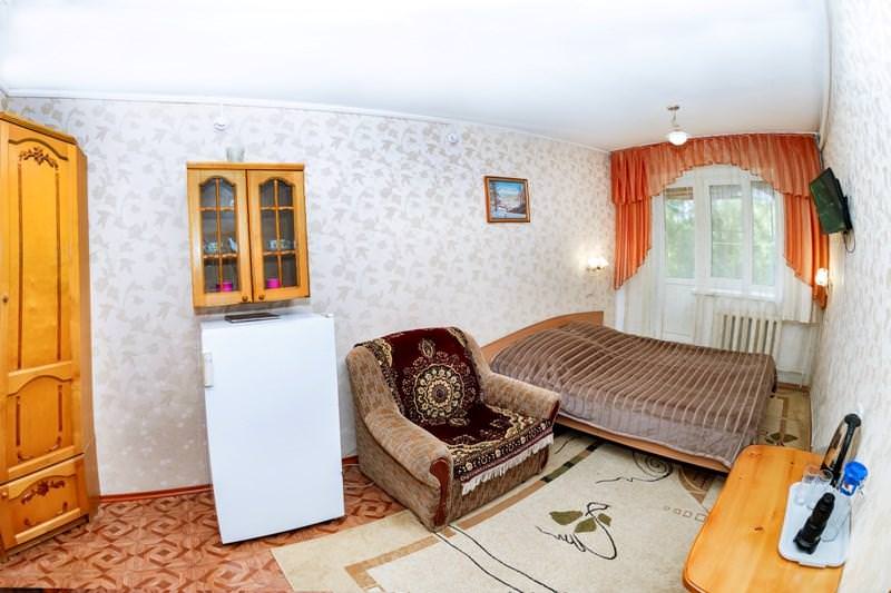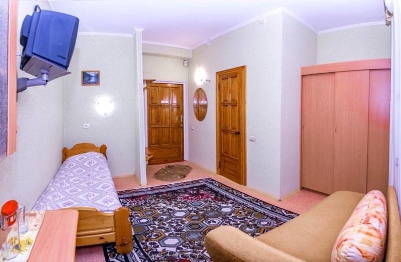 Просторный однокомнатный номер. Интерьер создан для комфортного проживания одного гостя. В номере: односпальная кровать, столик, шкаф, телевизор, холодильник, ванная комната, фен.