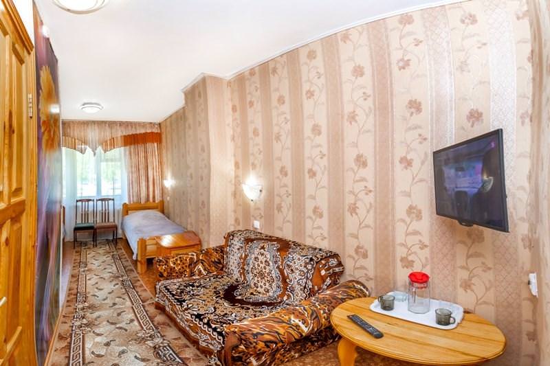 Однокомнатный номер с балконом. Подходит для комфортного проживания двух гостей. В номере две односпальные кровати, столик, стулья, шкаф, телевизор, чайник, удобства (душ, туалет) расположены в номере.